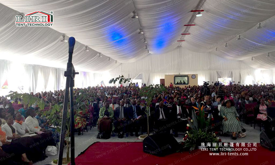 According to the expression of the tent installer, this is a 30x45m large span canopy tent used for churches in Africa. It can accommodate up to 1,500 people entering at the same time to facilitate mass activities.